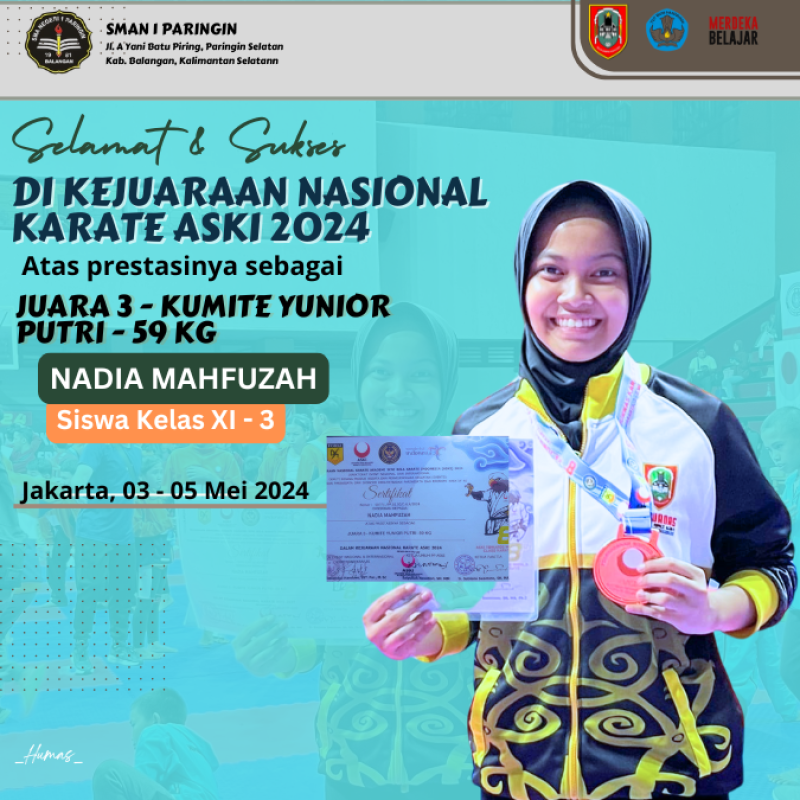 Siswi kelas XI - 3 SMAN 1 Paringin atas nama ananda Nadia Mahfuzah berhasil menjadi JUARA 3 - KUMITE YUNIOR PUTRI - 59 KG pada kejuaraan nasional karate ASKI 2024 yang berlangsung di Jakarta tanggal 03-05 mei 2024. @hms