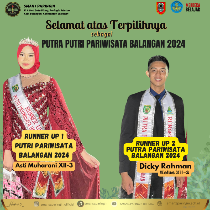 Sabtu 14 September 2024, sekolah mendapatkan kabar gembira dimana ada siswa siswi SMAN 1 Paringin yang mengikuti ajang pemilihan Putra Putri Pariwisata Kabupaten Balangan 2024 atas nama ananda Asti Muharani kelas XII-3 terpilih sebagai juara RUNNER UP 1 dan Dicky Rahman kelas XII-2 terpilih sebagai RUNNER UP II