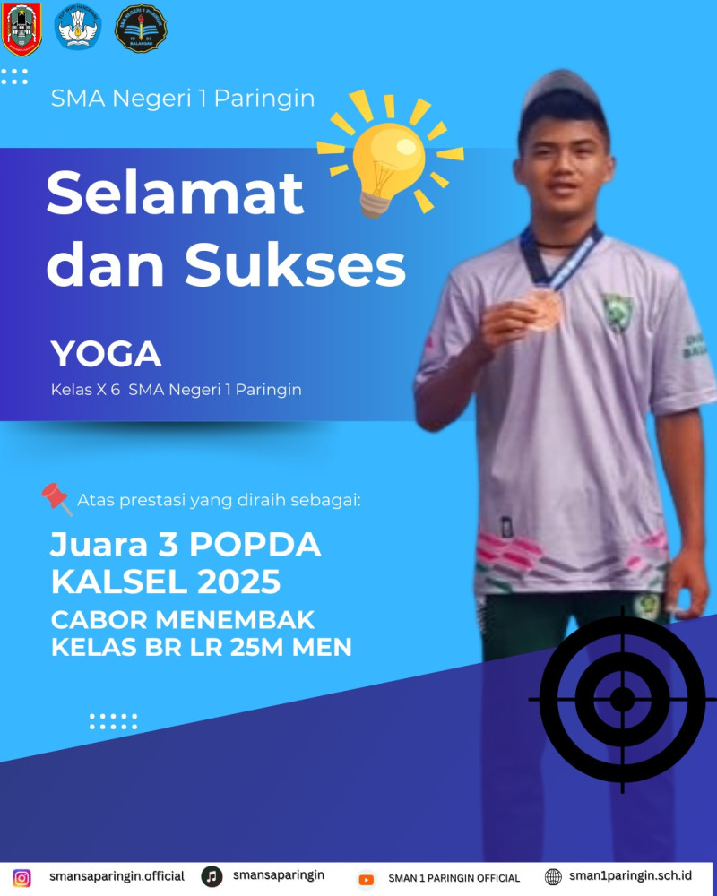 Paringin – Prestasi membanggakan kembali diraih oleh salah satu siswa SMA Negeri 1 Paringin dalam ajang olahraga tingkat provinsi. Yoga, siswa kelas X-6, berhasil meraih Juara 3 dalam cabang olahraga Menembak pada Pekan Olahraga Pelajar Daerah (POPDA) Kalimantan Selatan 2025.